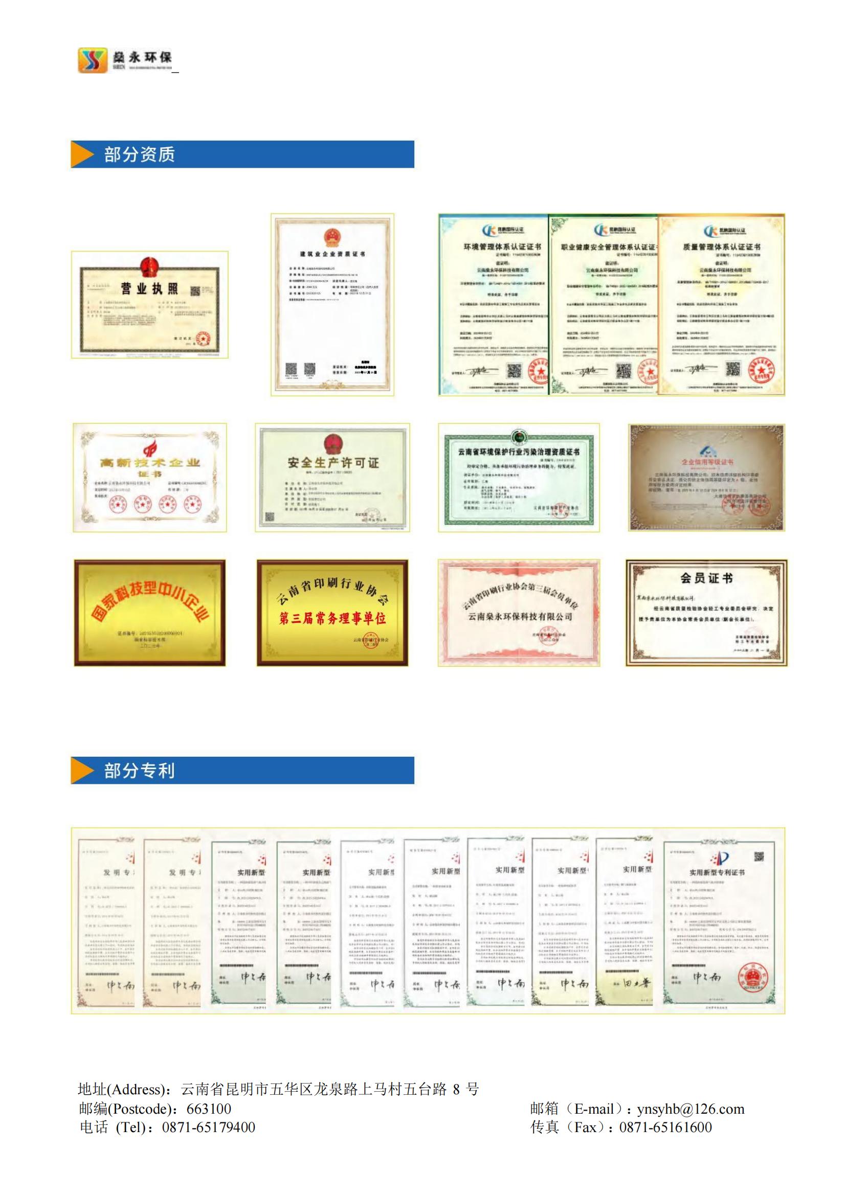 燊永公司堅(jiān)持“創(chuàng)新、協(xié)作、共贏”的價(jià)值觀,以“專業(yè)、專心、專注”為服務(wù)理念,以“求實(shí)、求是、求精”為質(zhì)量宗旨,為客戶提供優(yōu)質(zhì)、高效、貼心的服務(wù)。公司獲得國家專業(yè)部門頒發(fā)的《環(huán)境工程專業(yè)承包三級(jí)》資質(zhì)、《污染治理乙級(jí)》資質(zhì)、《企業(yè)信用等級(jí)A級(jí)》證書、《云南省科技型中小企業(yè)》認(rèn)定證書、《ISO9001/GBT50430質(zhì)量管理體系》證書、《ISO14001環(huán)境管理體系》證書、《ISO45001職業(yè)健康安全管理體系》證書等多項(xiàng)榮譽(yù)和多項(xiàng)的專利技術(shù)。